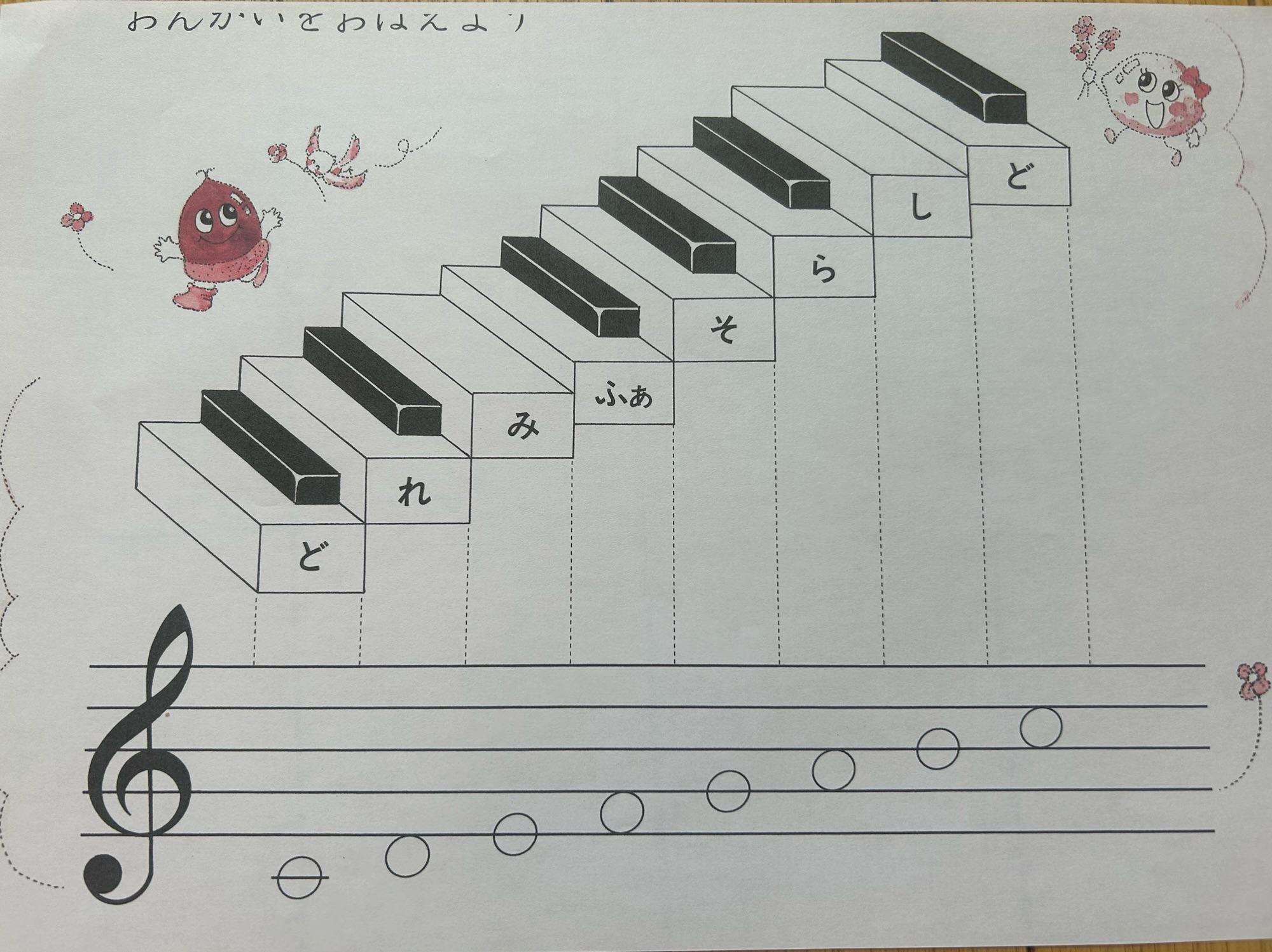 おんぷの長さとドレを習ったので4小節の楽譜を一緒に読む練習。そしてピアノ伴奏に合わせて歌うことができました。すごい✨