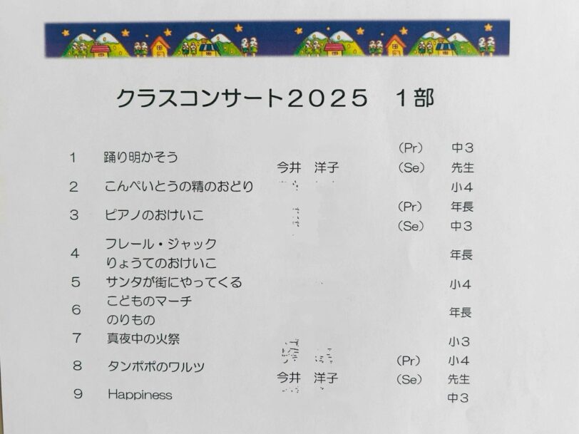 クラスコンサートの3ヶ月ほど前に、演奏曲のリクエストを1人ずつ聞きます。弾いてみたい曲があれば可能な限り好きな曲に挑戦、なければ難易度や曲調の好みを聞いた上で先生が3曲ほど選曲。その中で生徒さん自身が選びます。